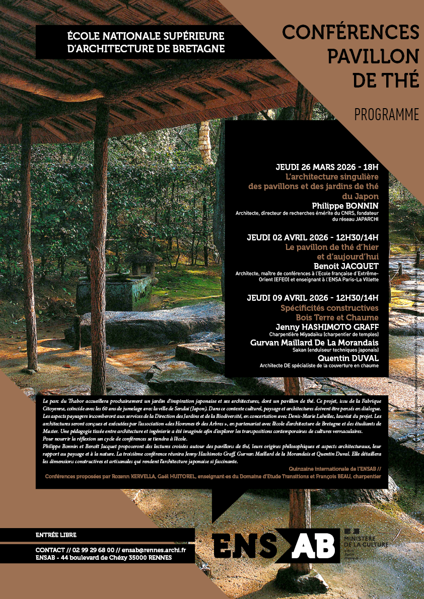 Philippe Bonnin et Benoît Jacquet proposeront des lectures croisées autour des pavillons de thé, leurs origines philosophiques et aspects architecturaux, leur rapport au paysage et à la nature. La troisième conférence réunira Jenny Hashimoto Graff, Gurvan Maillard de la Morandais et Quentin Duval. Elle détaillera les dimensions constructives et artisanales qui rendent l’architecture japonaise si fascinante.