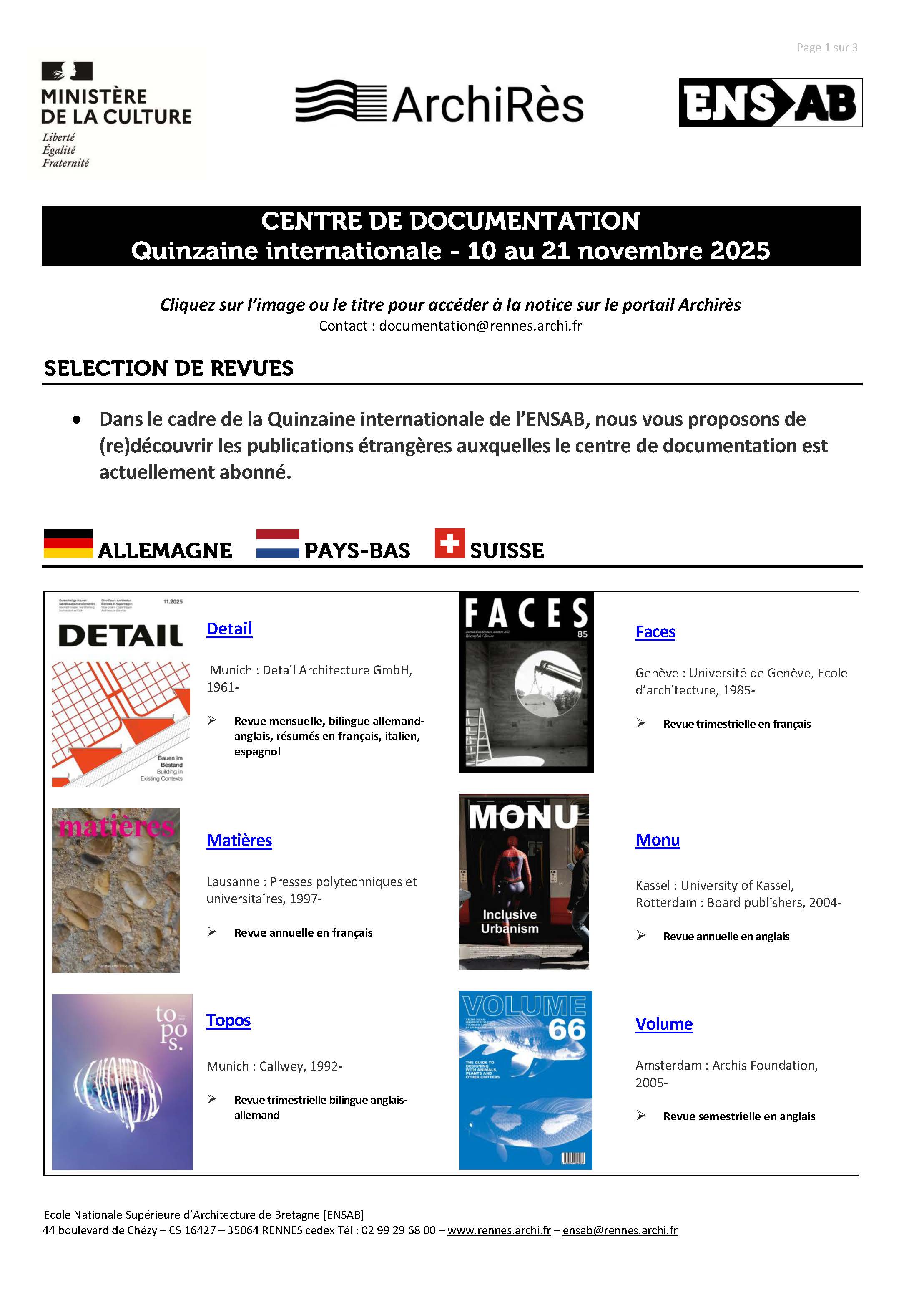 À l’occasion de la Quinzaine internationale de l’ENSAB, le centre de documentation vous propose une sélection de ressources et de publications étrangères disponibles à la consultation. Dans le cadre de cet événement, nous vous invitons à (re)découvrir les revues internationales auxquelles le centre de documentation est actuellement abonné. Une occasion unique de vous immerger dans des perspectives architecturales et culturelles venues du monde entier. Pour toute question ou demande d’information : documentation@rennes.archi.fr