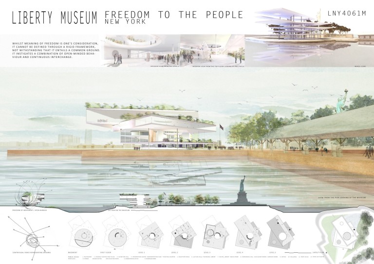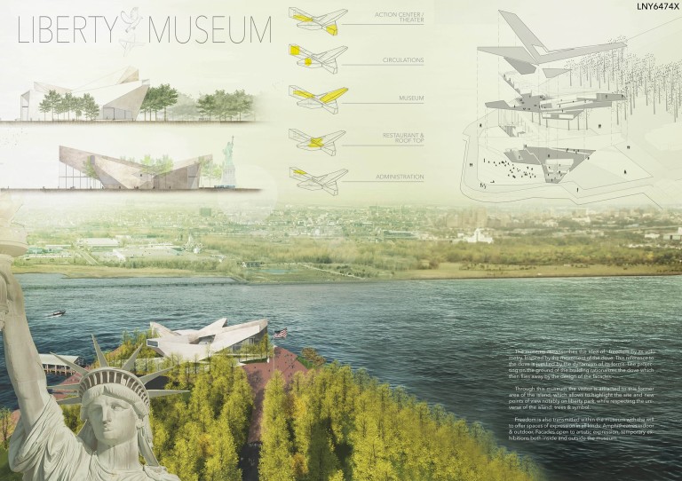 Liberty Museum | New York City : freedom to the people est un concours d’architecture visant à créer un nouvel endroit symbolisant la cause des droits civils et de la justice sociale. Alors que la Statue de la Liberté approche de son 130e anniversaire, le nouveau Musée prendrait place tout près sur l’île de la Liberté. Il permettrait de réunir différentes ethnies et cultures, et de promouvoir la paix universelle.
