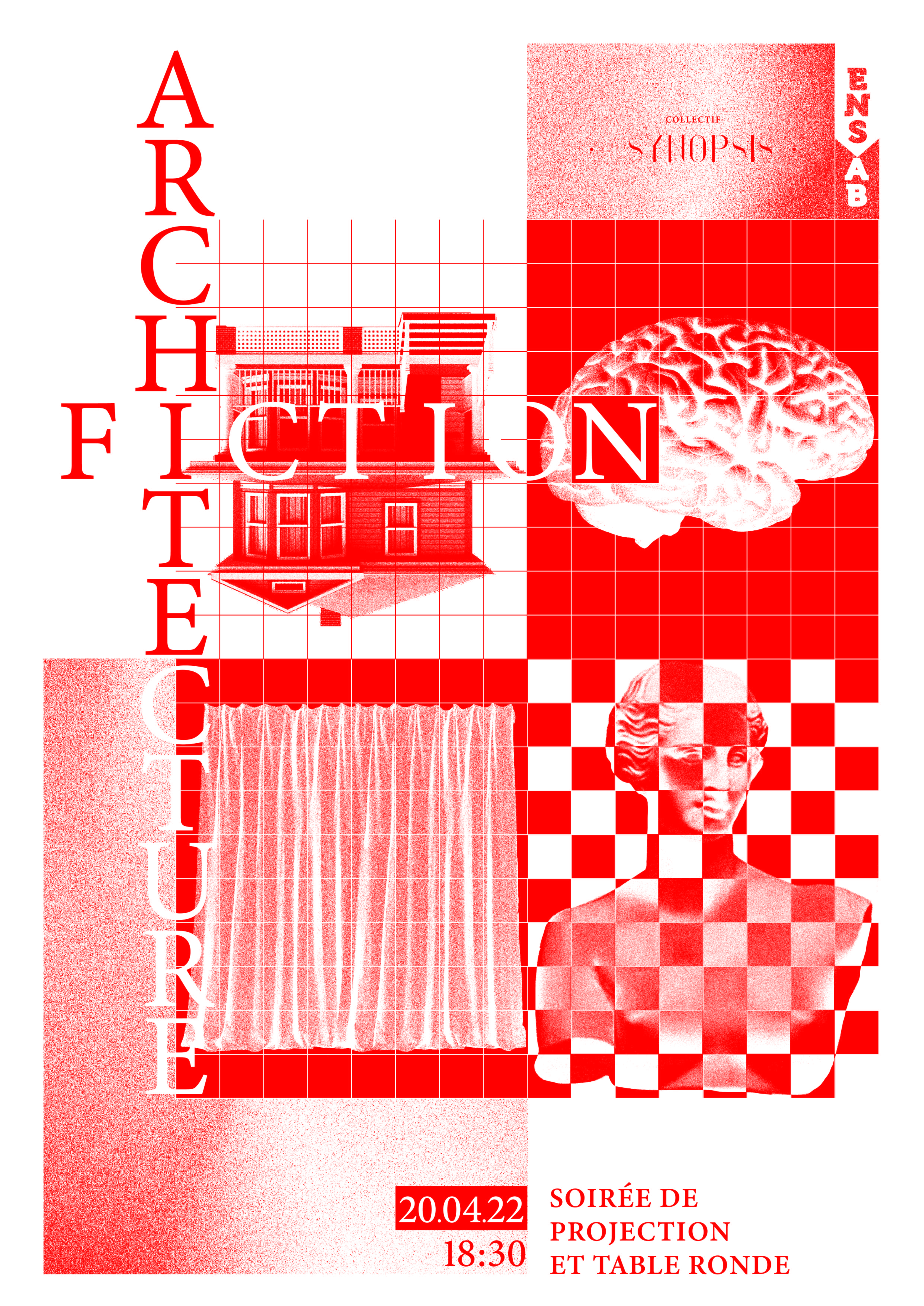 Le collectif Synopsis, un ensemble d’étudiants de l’ENSAB des promotions 2016 et 2017, propose d’engager une réflexion autour de la fiction dans la conception architecturale. Il s’agit d’une exploration participative et collective gravitant autour de 4 axes fondamentaux : mythe, fantasme, satire et réminiscence. Chacune de ces thématiques sera illustrée par des bribes de réflexions glanées au travers de la démarche fictionnelle de chaque production. Le collectif cherche ainsi à extraire le récit sous-jacent des différentes productions architecturales et de faire de la fiction, qui habite chaque projet, un sujet en tant que tel. L’aboutissement de ce travail est une exposition qui usera du format écrit, sonore, visuel au travers de la vidéo de la maquette et du dessin.