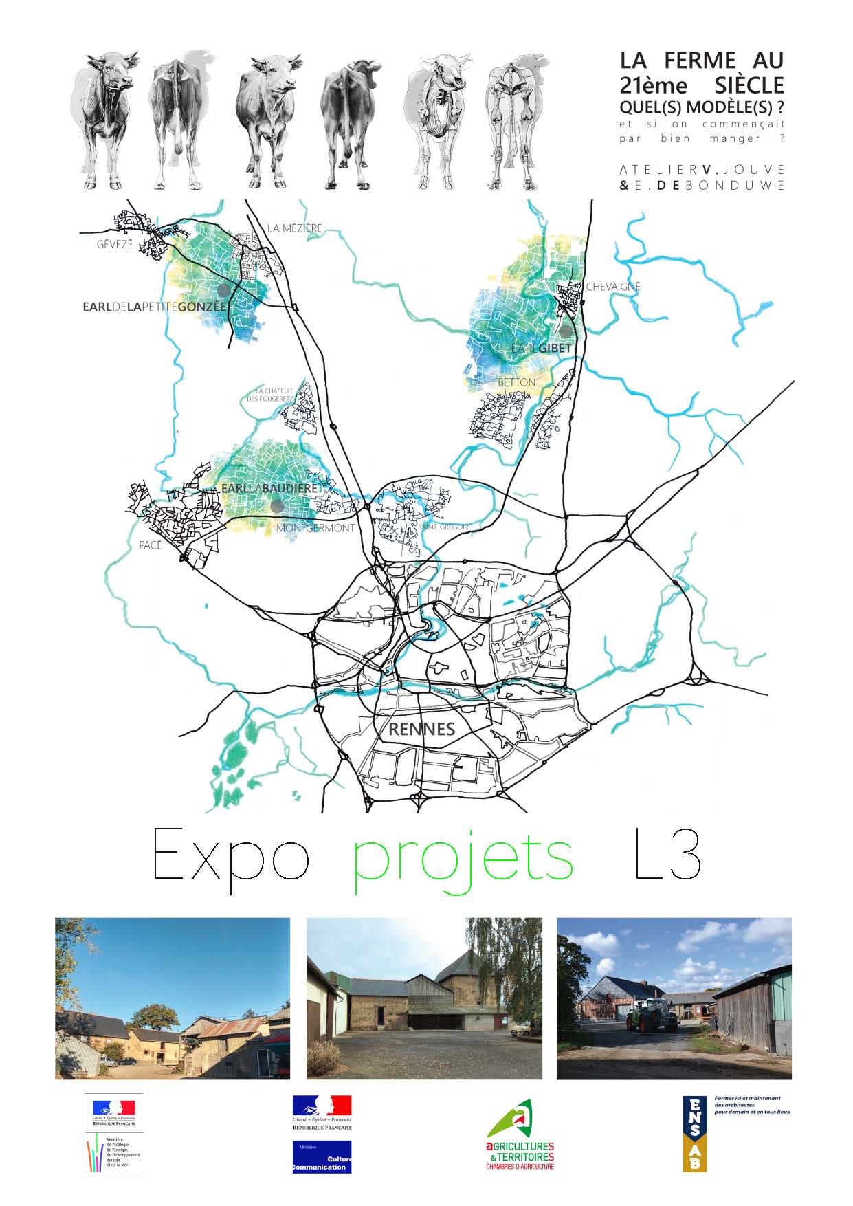 Après étude des grands enjeux contemporains liés à l’agriculture, les étudiants ont projeté le devenir de trois fermes situées en première couronne de Rennes : la Baudière à Pacé, La Géminais à Chevaigné, la Petite Gonzée à Gévezé.