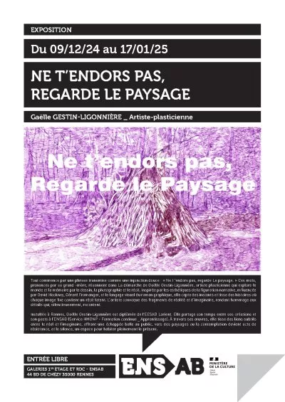 Installée à Rennes, Gaëlle Gestin-Ligonnière est diplômée de l’EESAB Lorient. Elle partage son temps entre ses créations et son poste à l’ENSAB (Service HMONP – Formation continue _ Apprentissage). À travers ses œuvres, elle tisse des liens subtils entre le réel et l’imaginaire, offrant une échappée belle au public, vers des paysages ou la contemplation devient acte de résistance, et le silence, un espace pour habiter pleinement le présent.