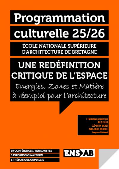 La programmation culturelle de l’ENSAB s’articule autour d’une thématique annuelle, définie lors d’un comité de sélection composé des enseignant·es de l’école. Elle comporte un cycle de conférences et des expositions majeures ; elle couvre une année universitaire, de septembre à mai.