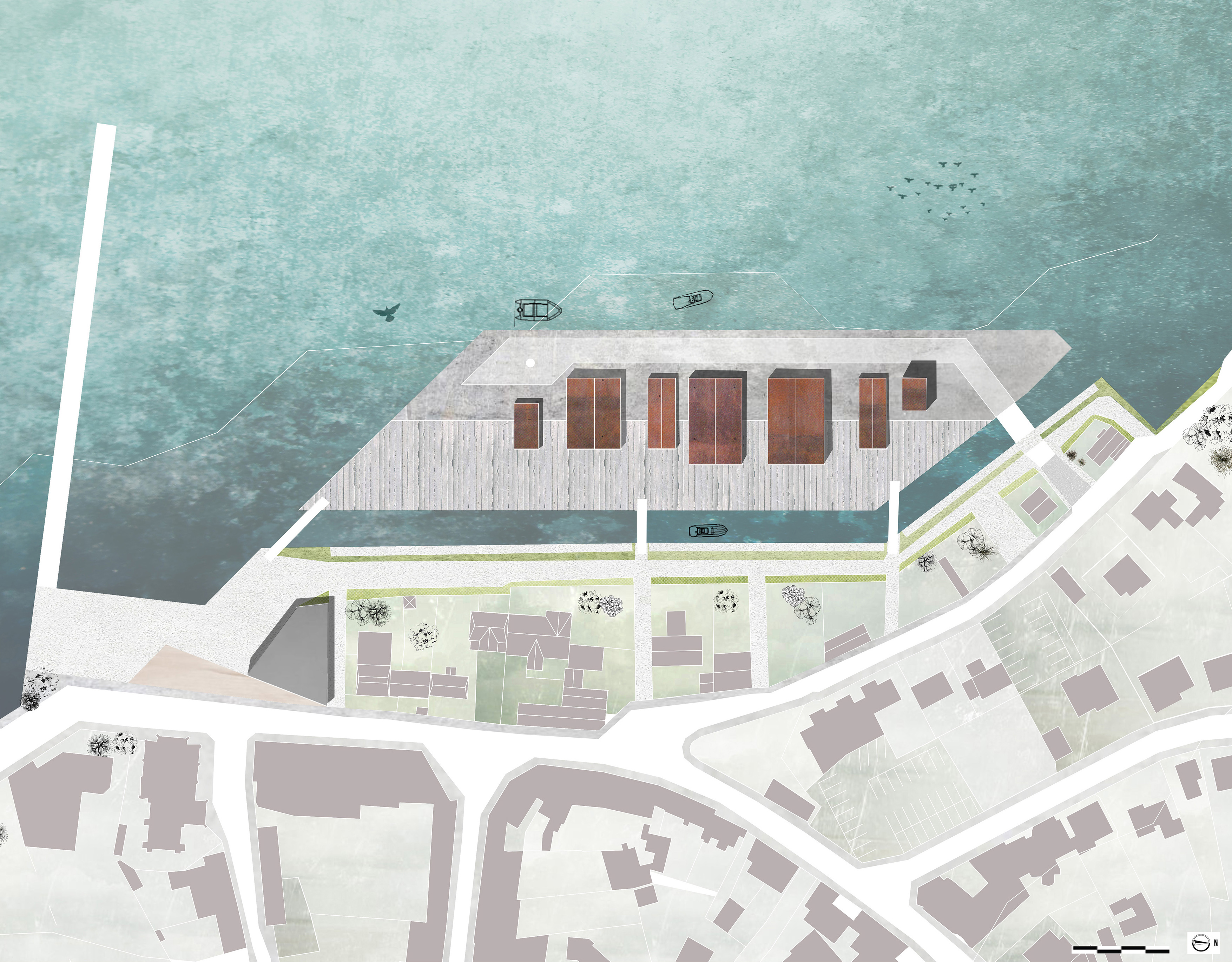 Capitainerie : 192m2, office du tourisme (+ espace d’exposition, café) : 728m2, halles : 280m2, réparation navale : 250m2, 2 restaurants : 190m2, bar : 41m2, criée : 548m2, île, promenade piétonne, place de l’église.