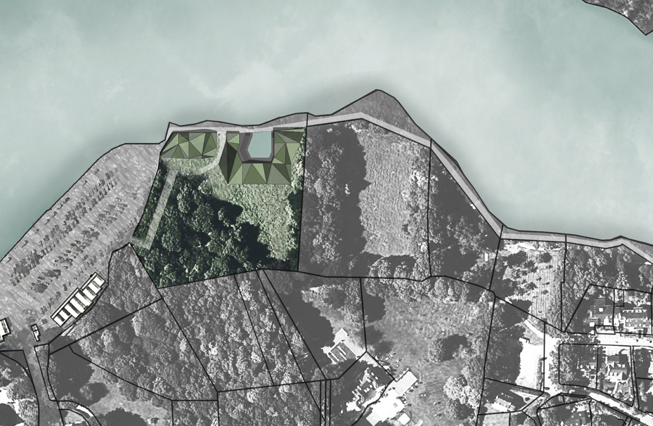 Le projet dialogue avec l’intégration paysagère, car j’ai choisis de fondre mon bâti dans le talus existant, bordé d’une promenade piétonne qui longe l’anse.
